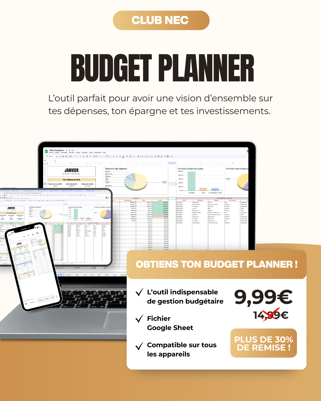 Tu avances en toute sérénité avec un accès immédiat au budget planner. Il est utilisable dès le premier jour, il ne demande aucun prérequis en gestion financière et il est pensé pour t'accompagner sur du long terme.